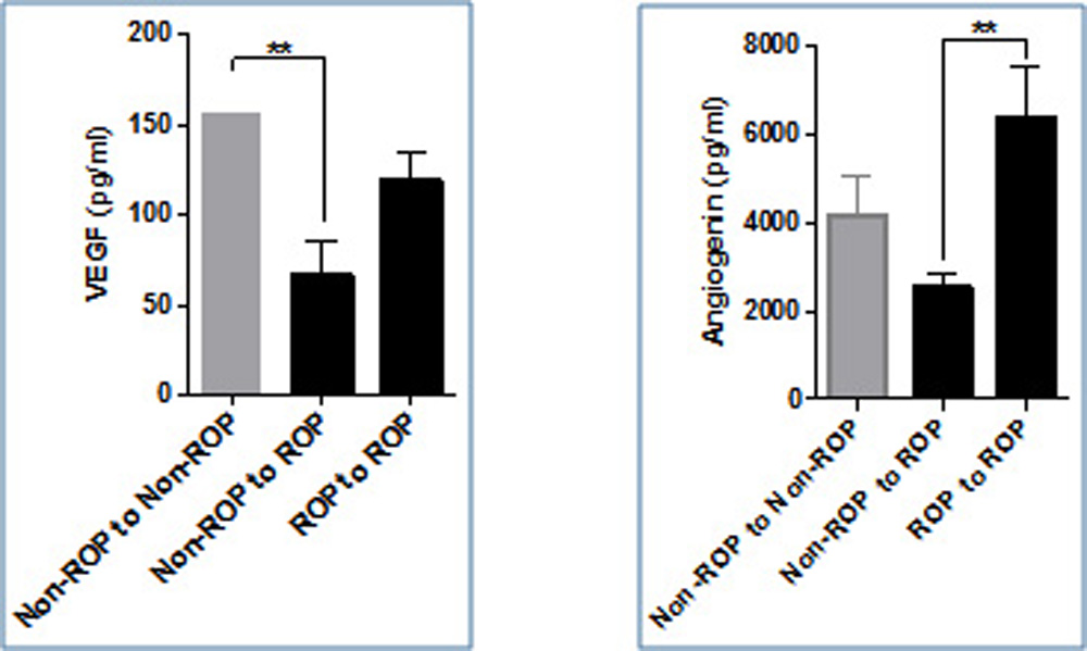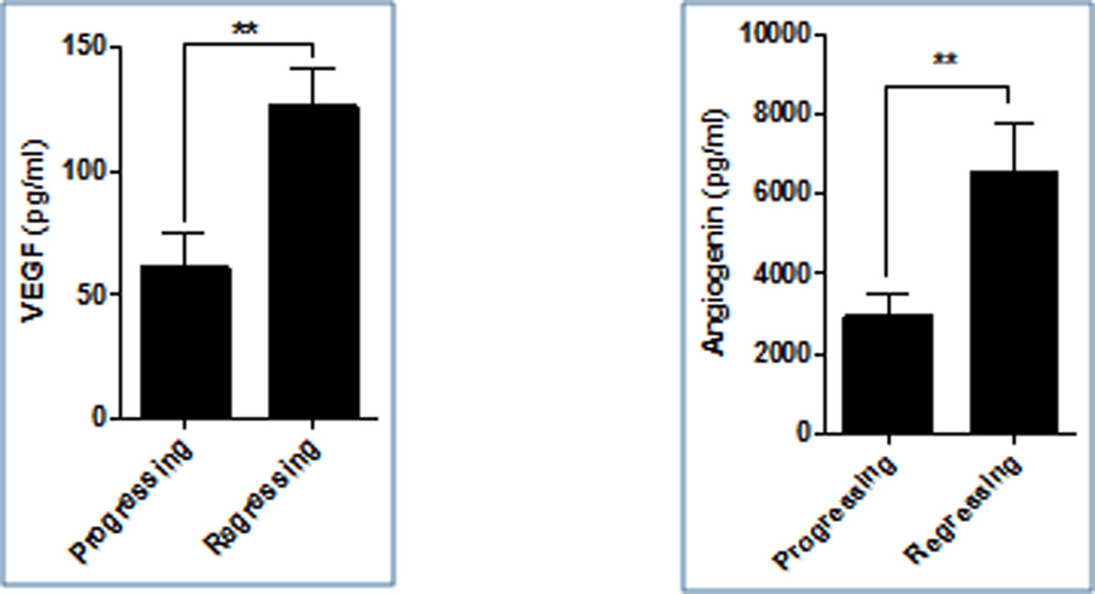- The levels of angiogenic factors i.e VEGF and angiogenin were elevated in patients who showed a resolution of disease stage compared to the progressing stage. This reflects presence of more angiogenic factors in a maturing retina which is in contrast to the fact that a maturing retina must express less of angiogenic factors