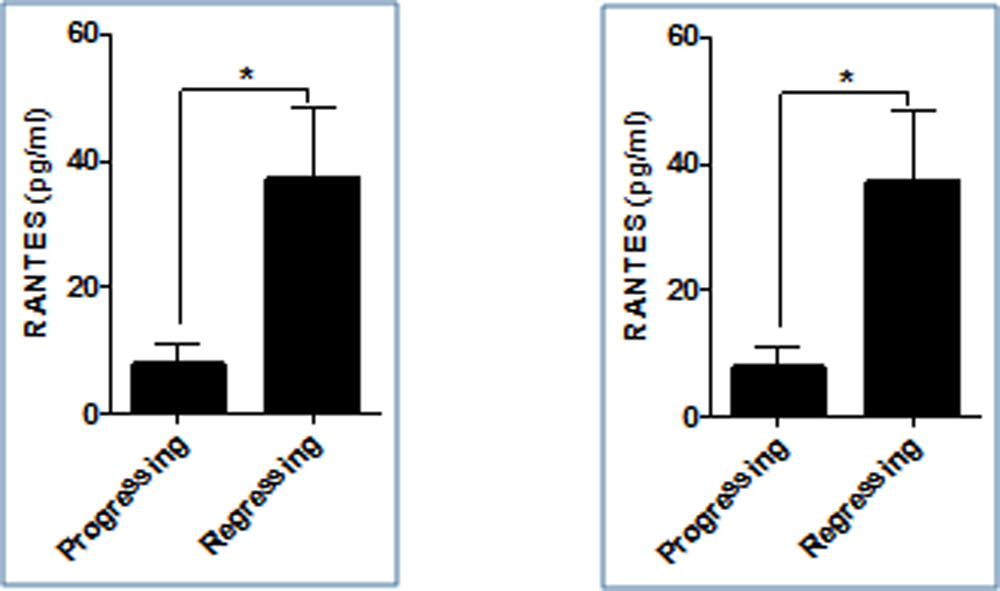 Figure 2: Bar graph showing levels of RANTES and MCP1 at first visit who progressed to a higher stage or regressed to a lower stage on subsequent second visit