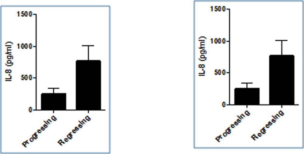 Figure 3: Bar graph showing levels of IL 8 and IL 6 at first visit who progressed to a higher stage or regressed to a lower stage on subsequent second visit