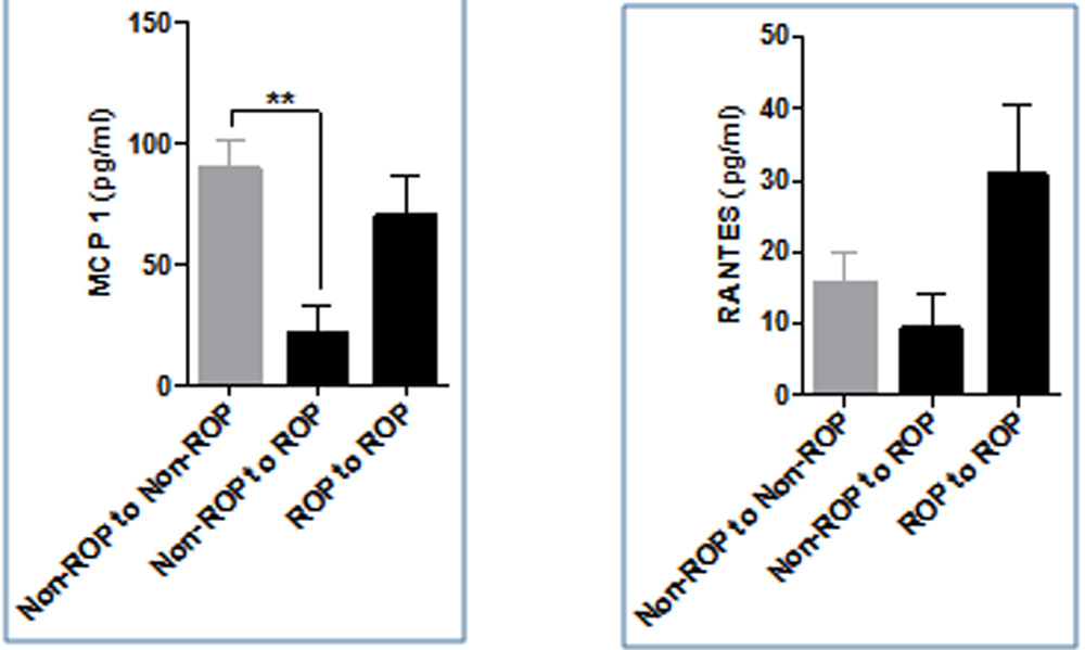 Figure 5: Bar graph showing levels of MCP 1 and RANTES at first visit in controls (Non ROP to non ROP), infants who progressed from no ROP to some stage ROP and in subjects who had ROP at first visit