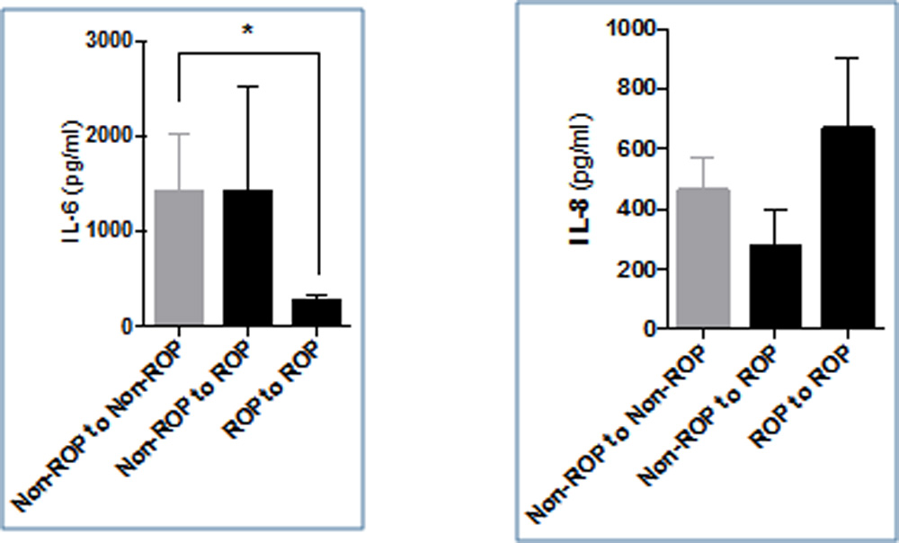 Figure 6: Bar graph showing levels of IL 6 and IL 8 at first visit in controls (Non ROP to non ROP), infants who progressed from no ROP to some stage ROP and in subjects who had ROP at first visit
